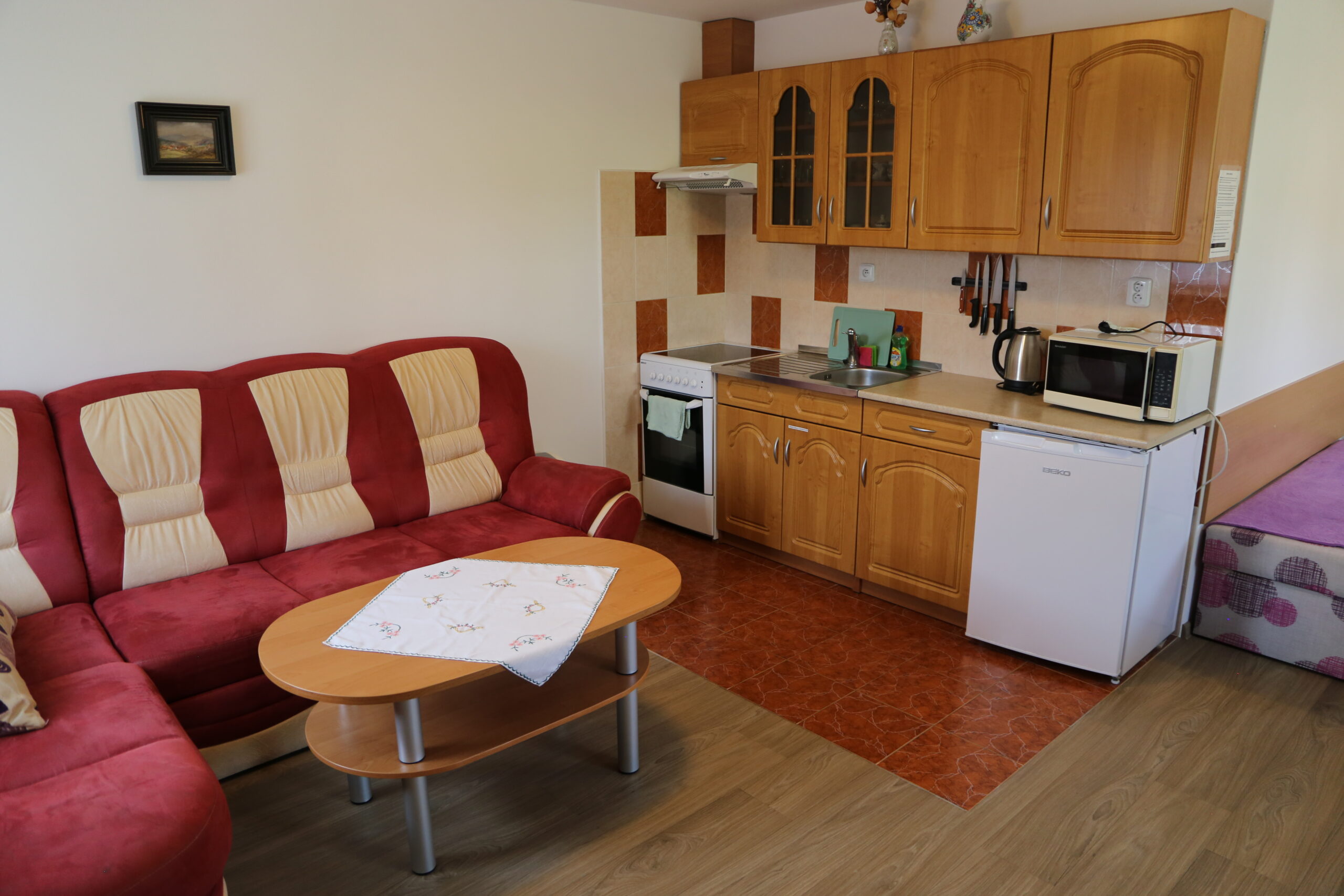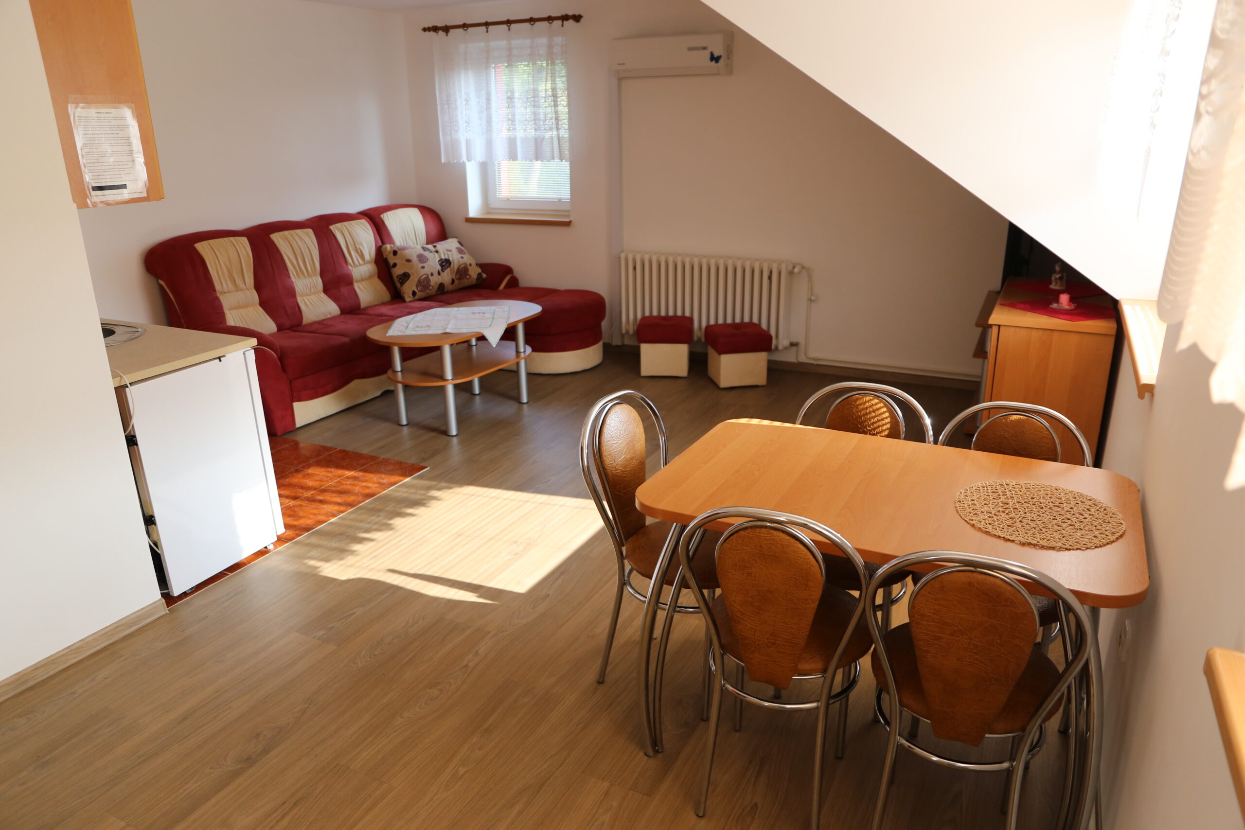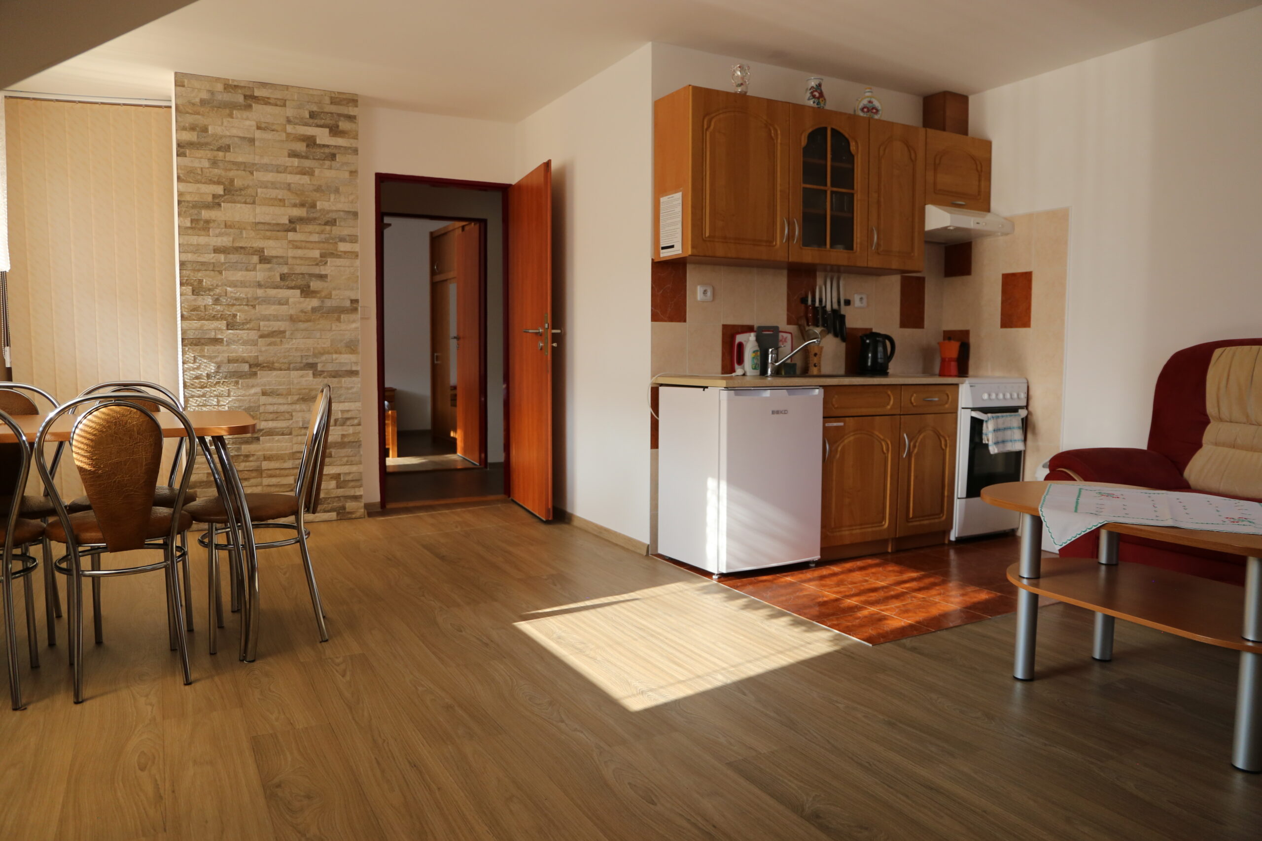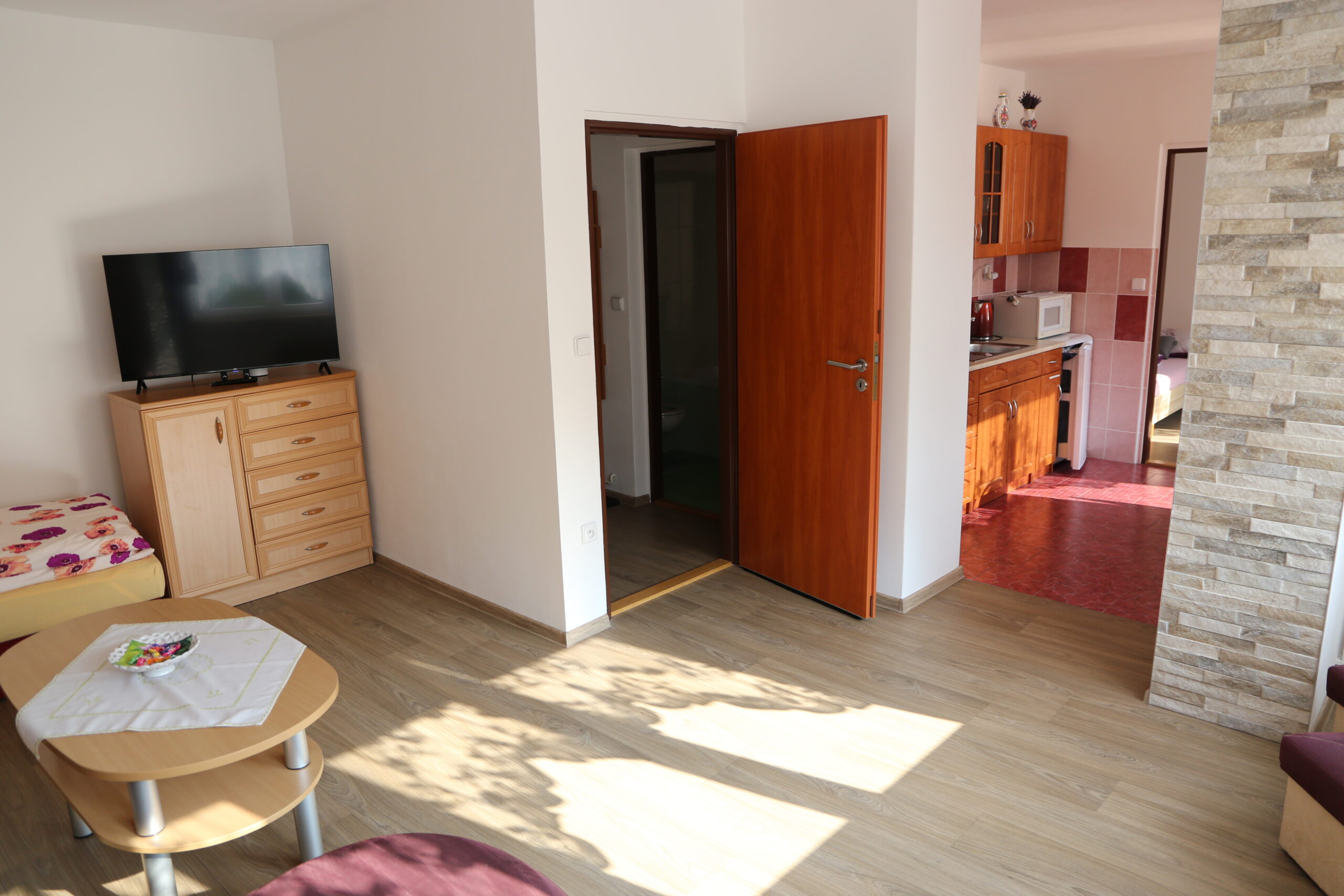 Apartmán s ložnicí, koupelnou, kuchyňkou a obývacím pokojem s rozkládací pohovkou.