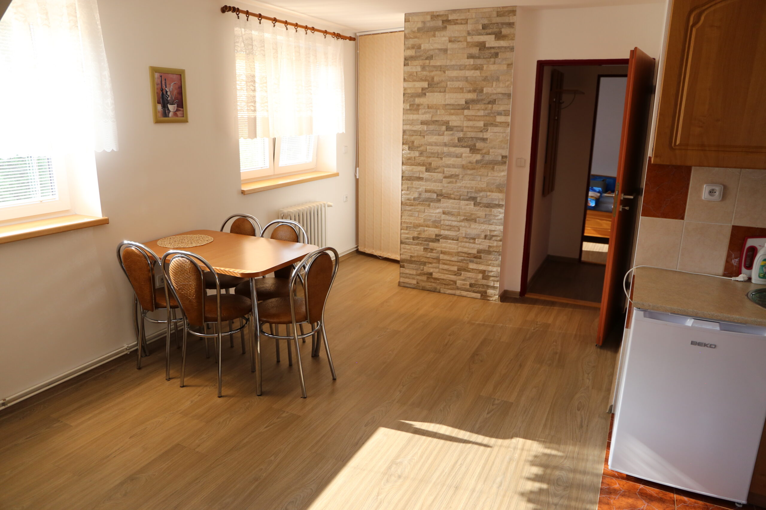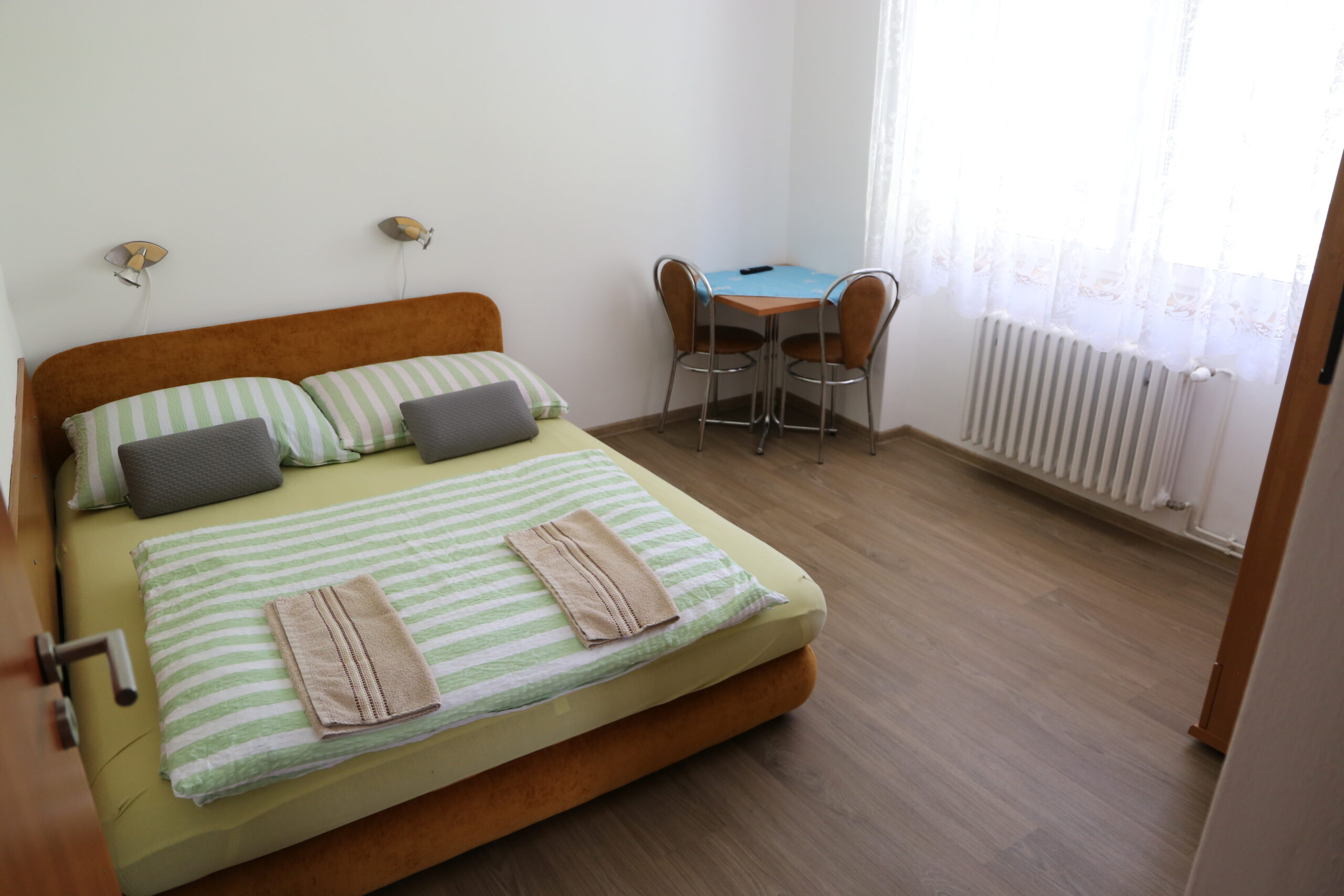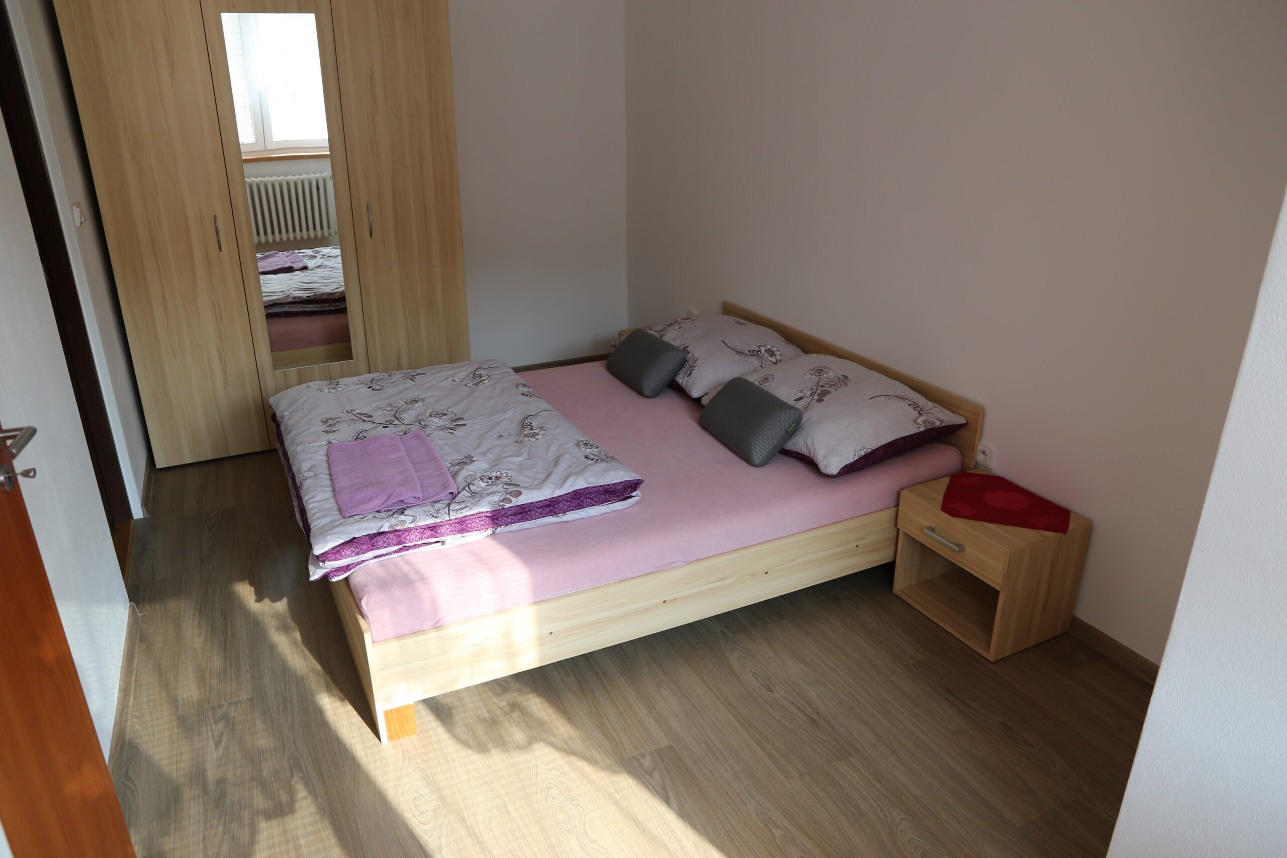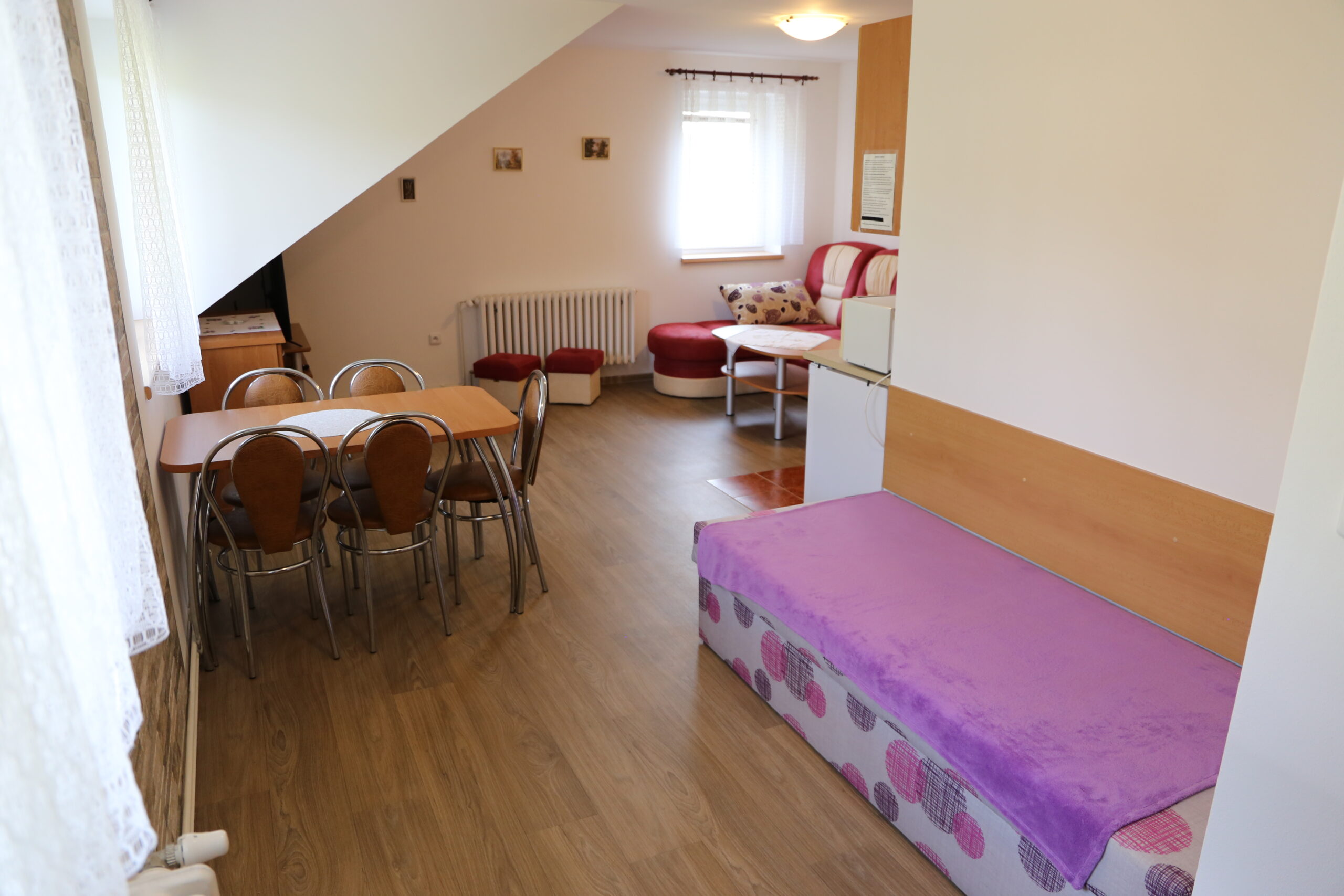 Apartmán s ložnicí, koupelnou, kuchyňkou a obývacím pokojem s rozkládací pohovkou.