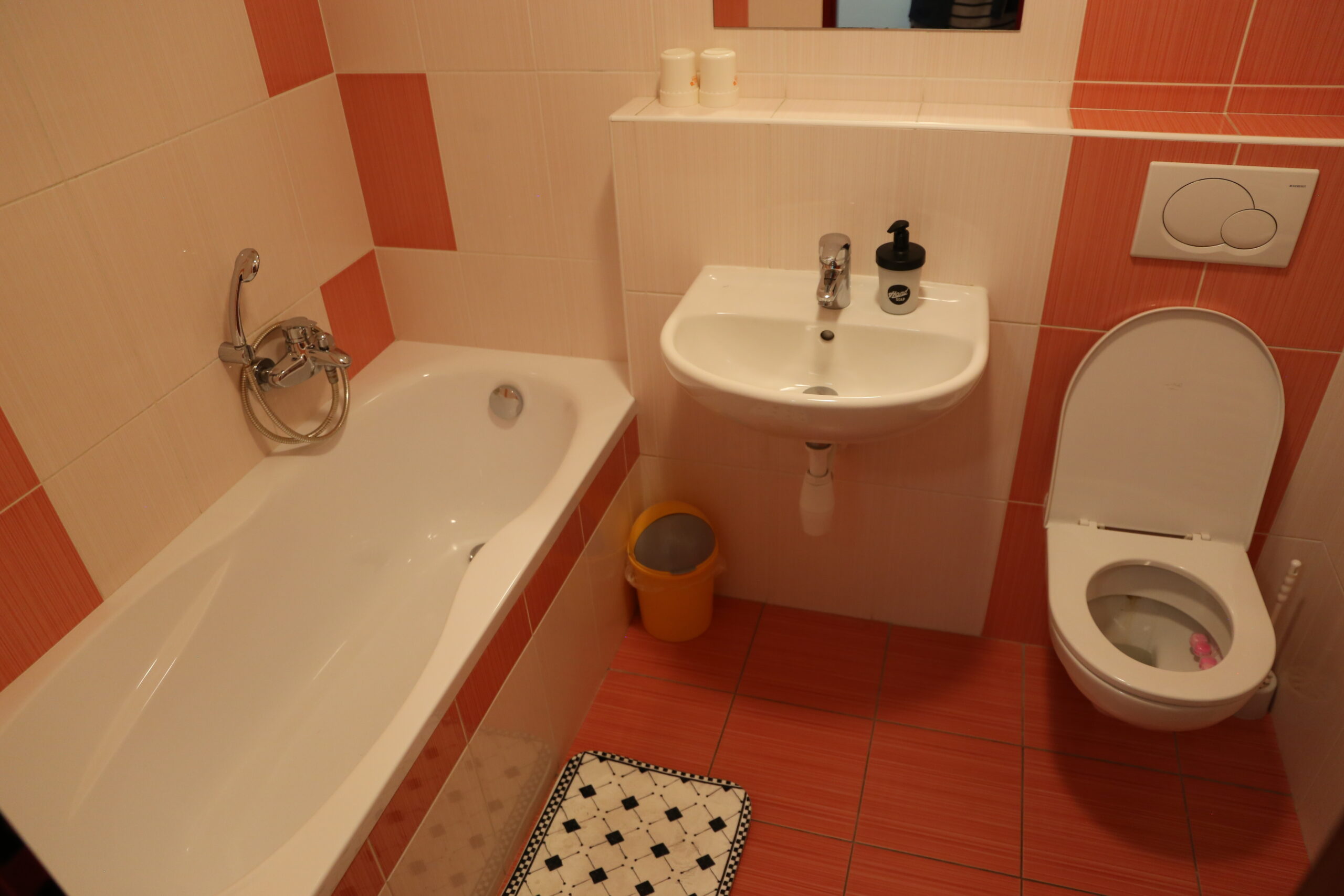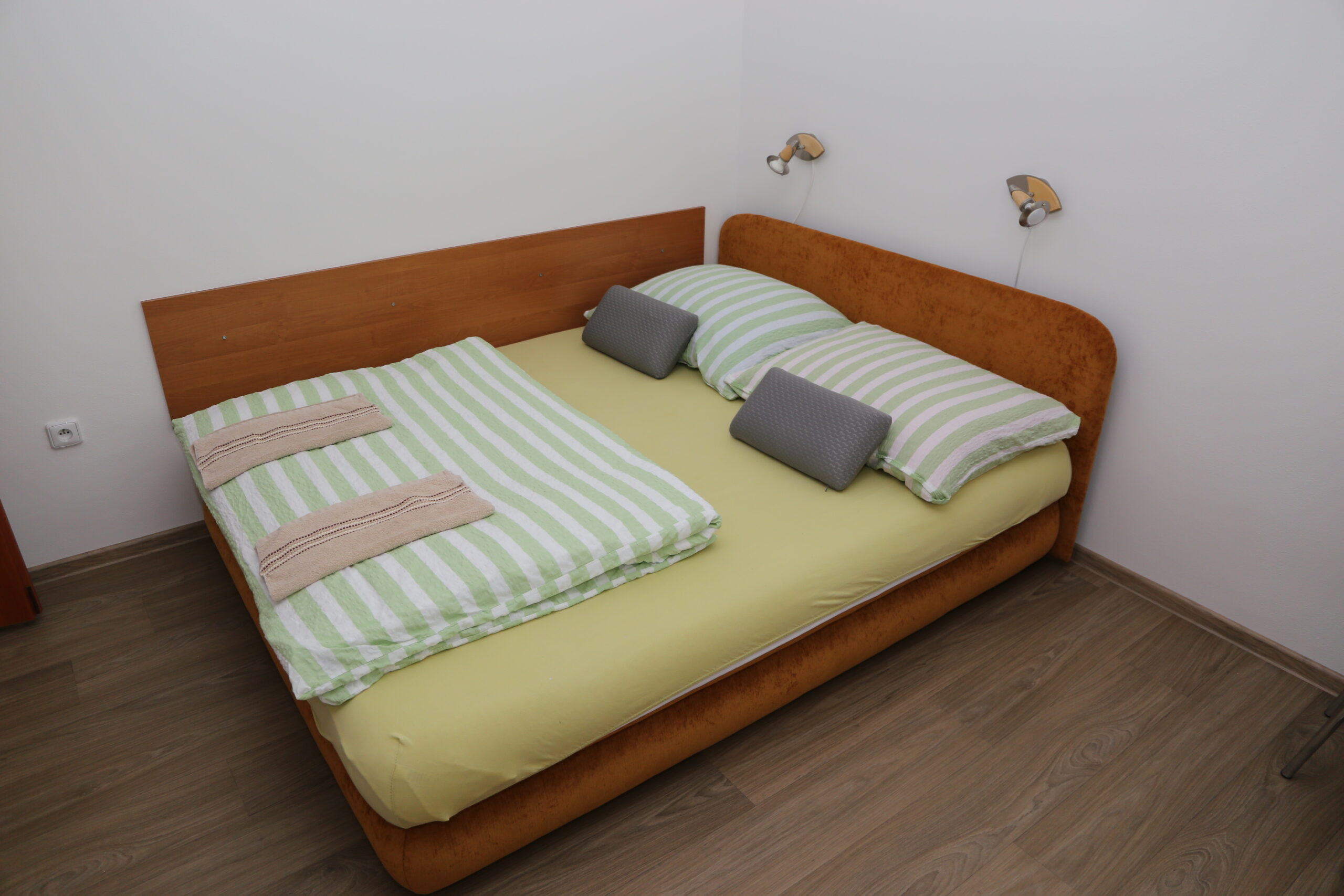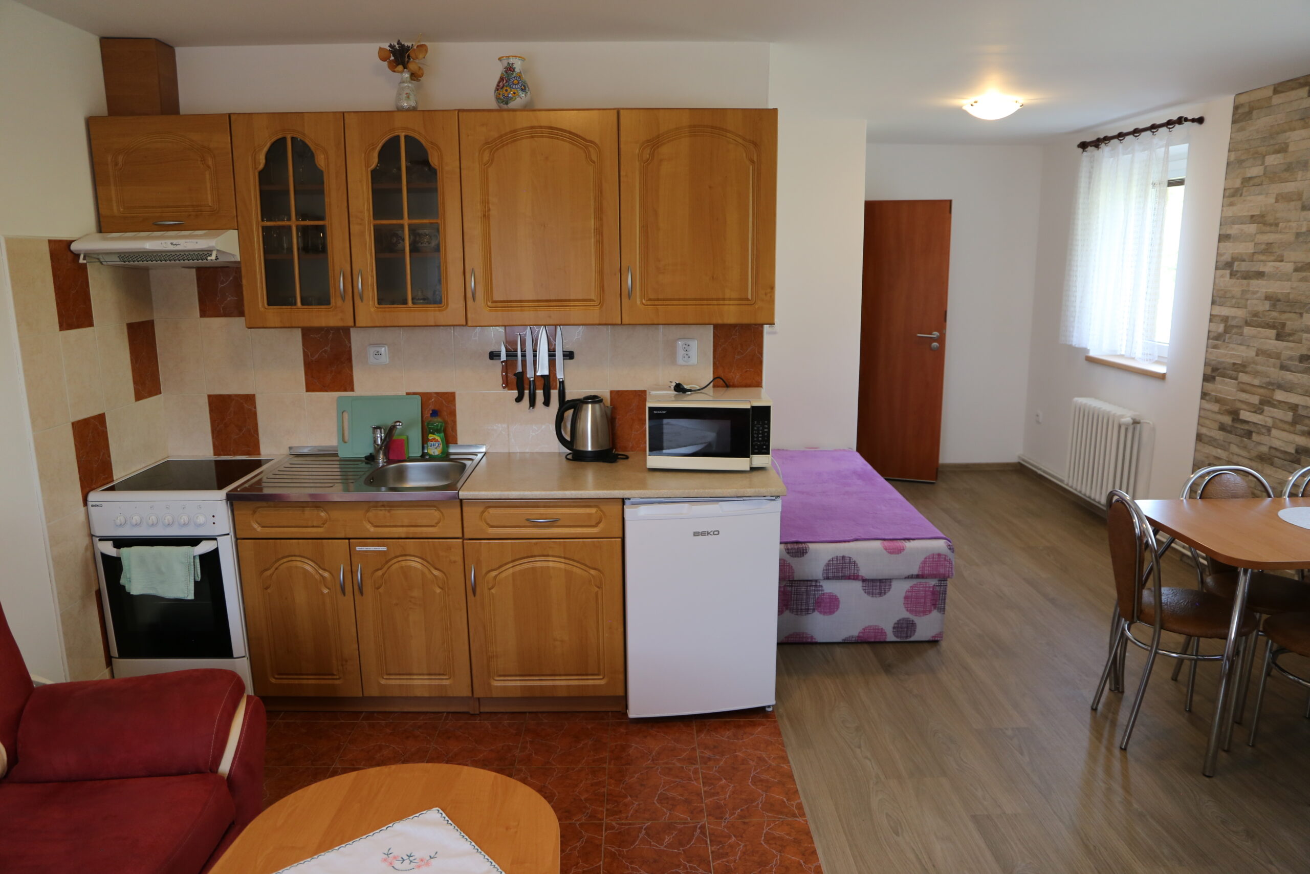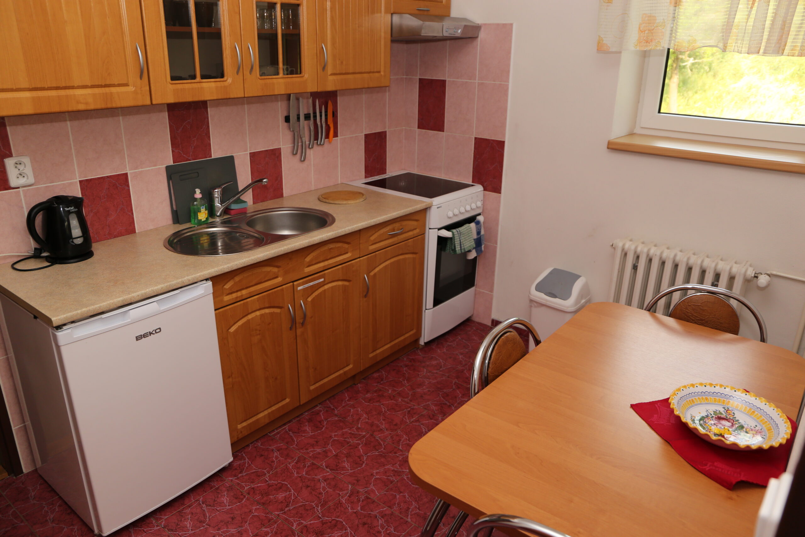 Apartmán s ložnicí, koupelnou, kuchyňkou a obývacím pokojem s rozkládací pohovkou.