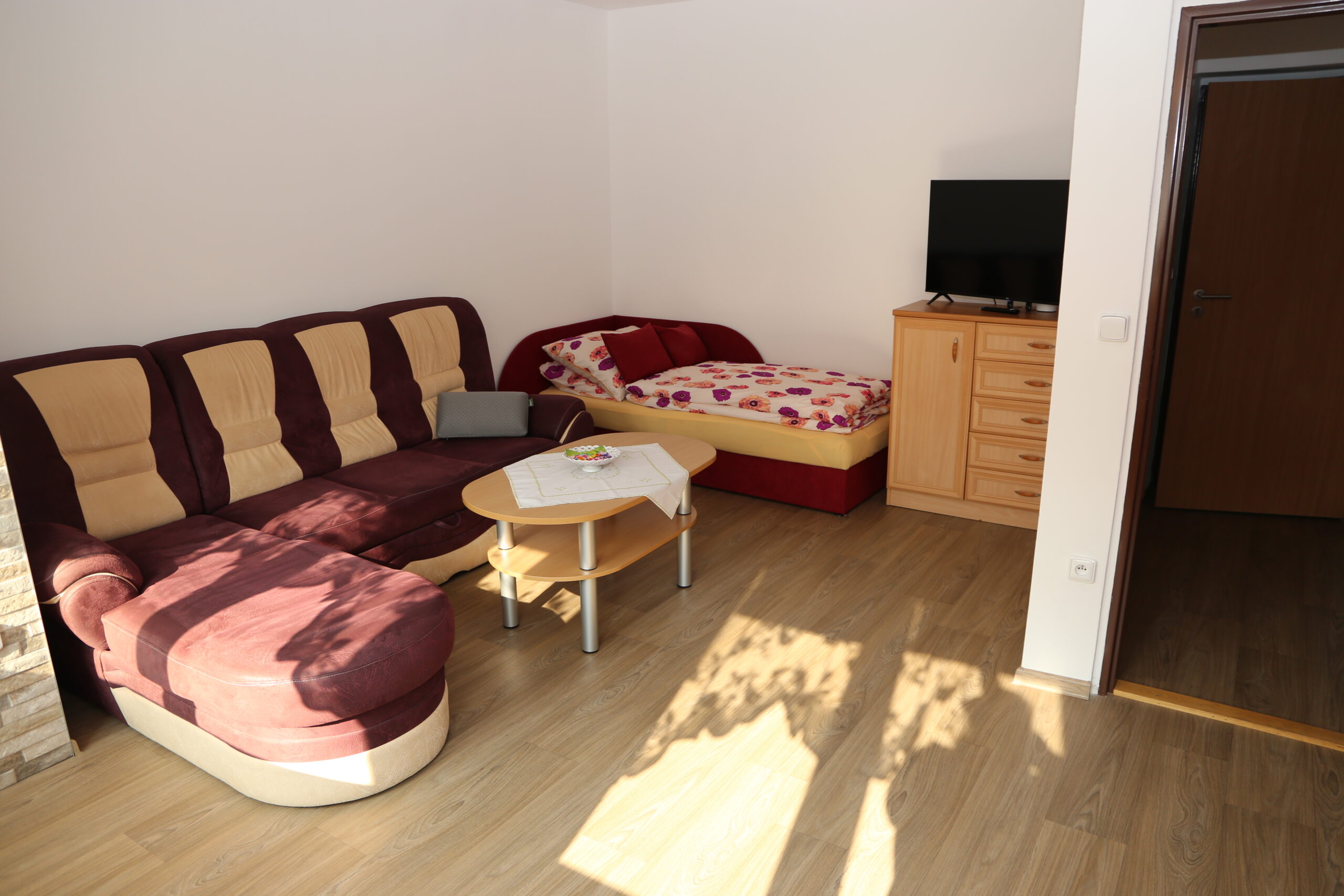 Apartmán s ložnicí, koupelnou, kuchyňkou a obývacím pokojem s rozkládací pohovkou a samostatnou postelí.