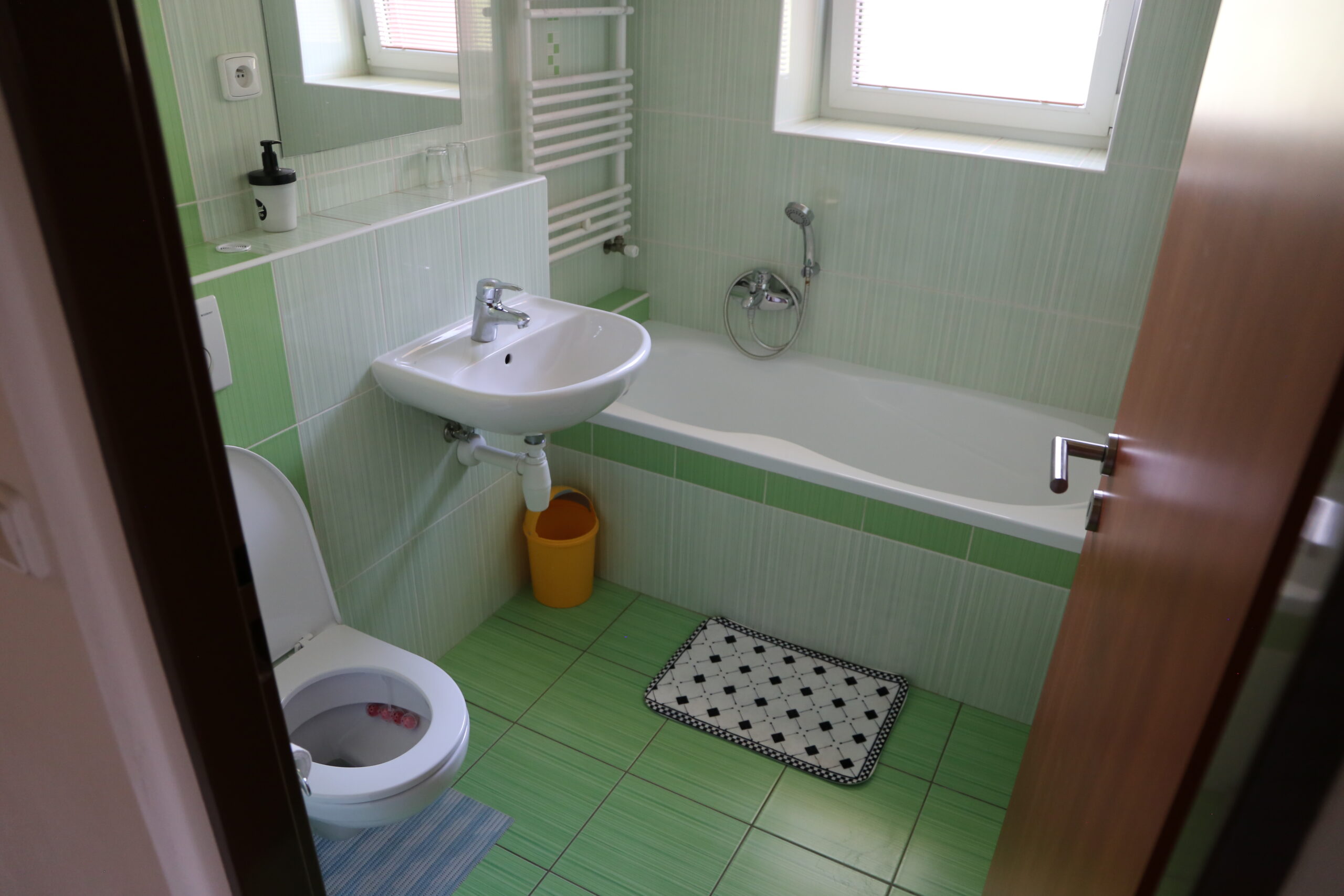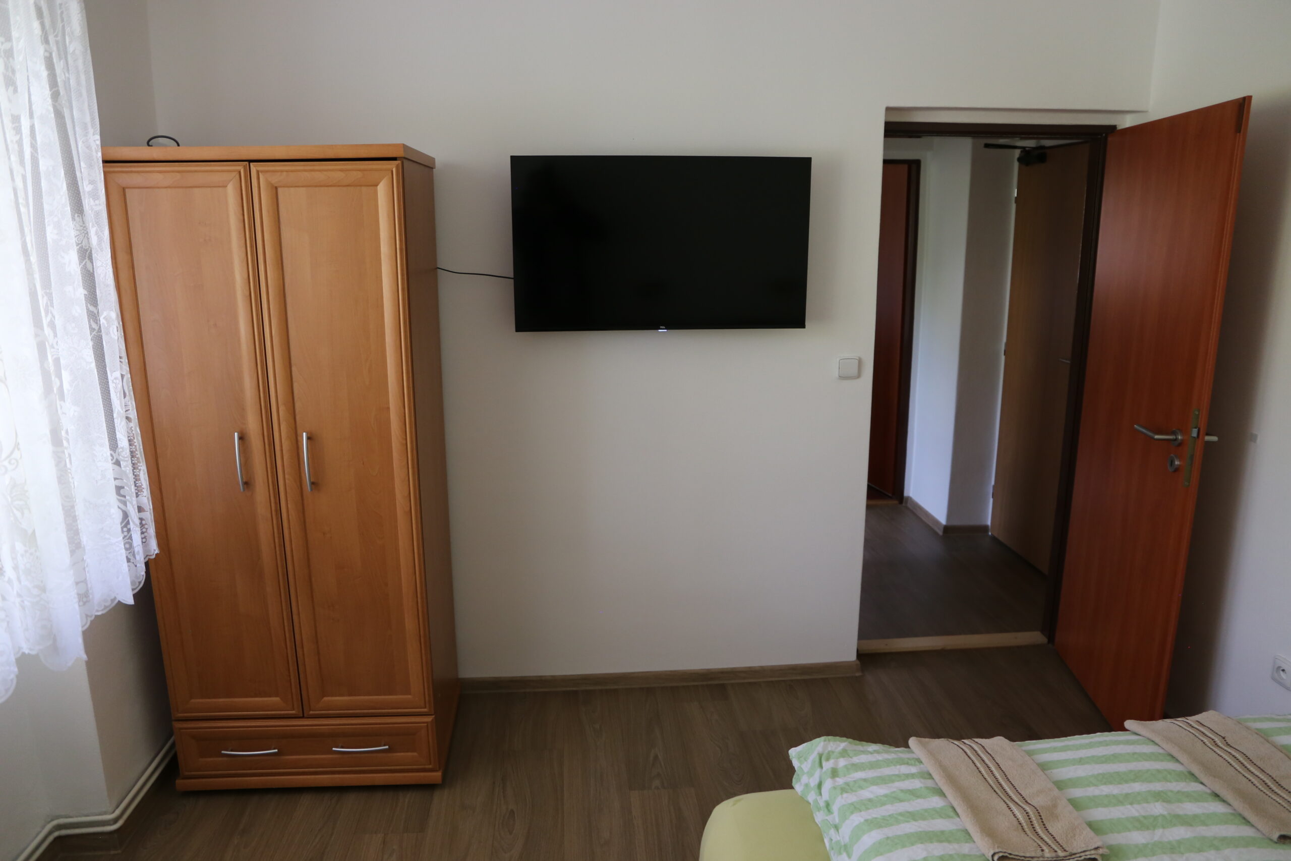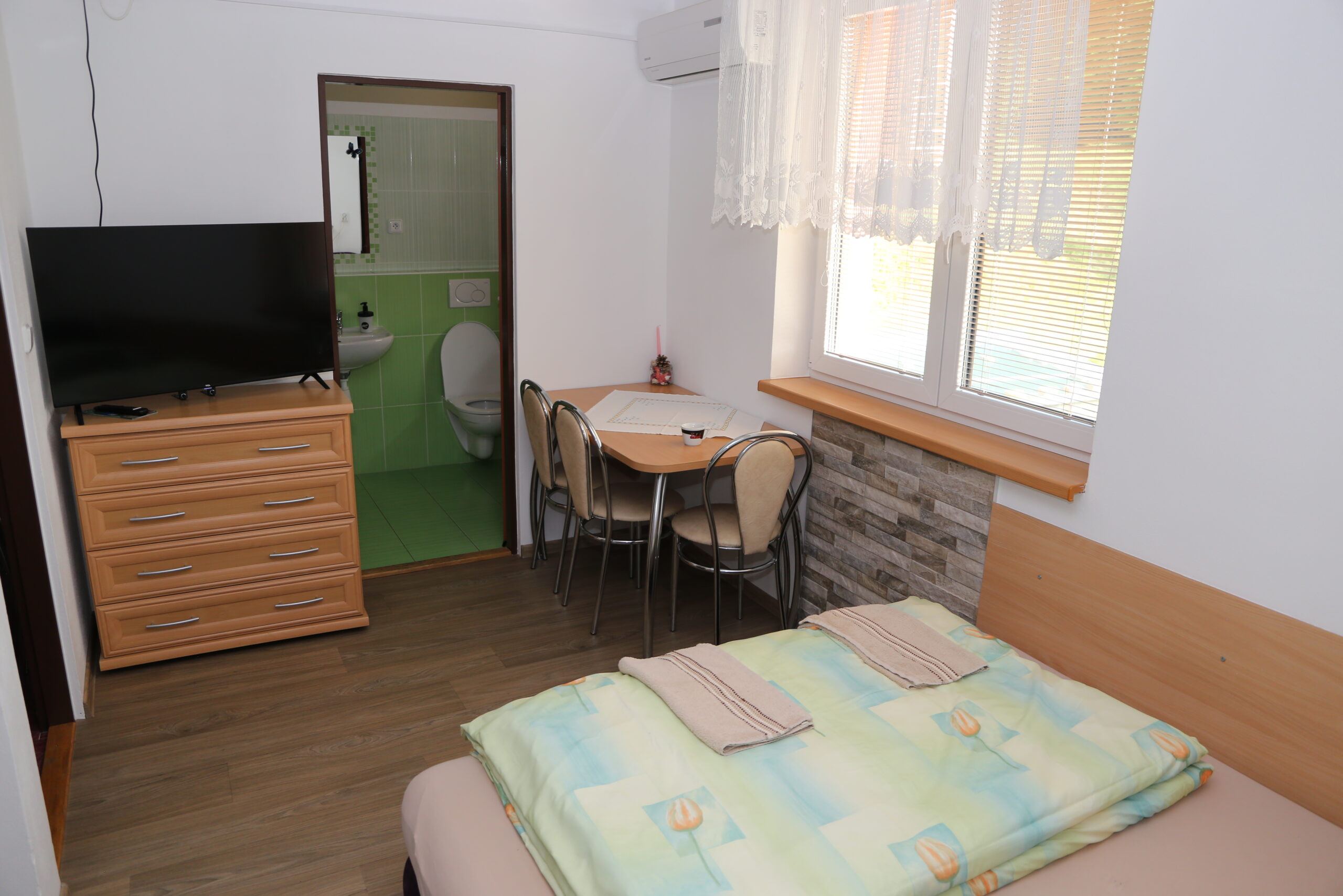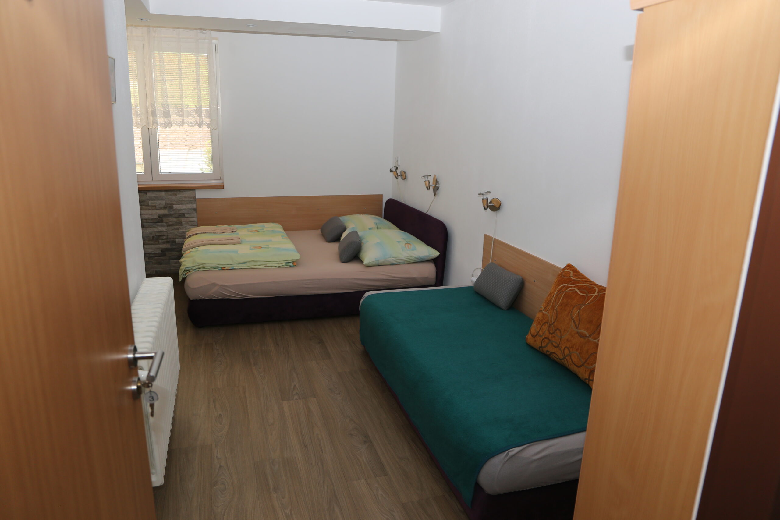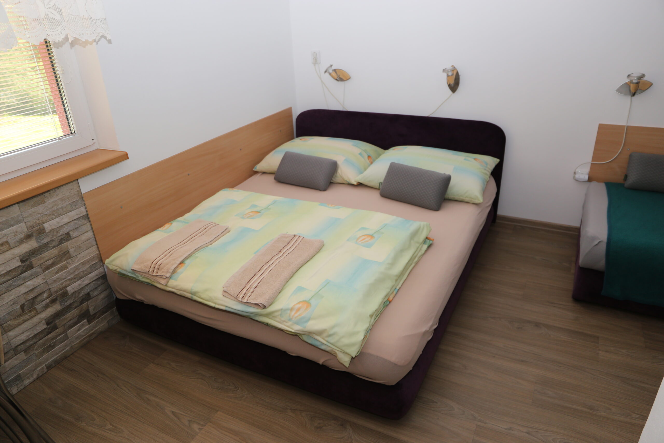 Pokoj s dvojpostelí, samostatnou postelí a koupelnou. Kuchyňka je společná s vedlejším pokojem.